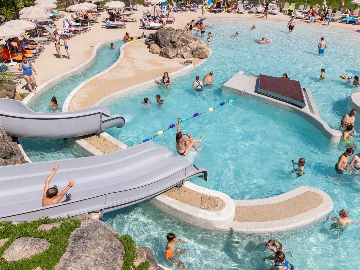 Einer der absoluten Höhepunkte von Camping Domaine des Bans ist ganz klar das riesige Wasserparadies, in dem Groß und Klein problemlos viele Stunden Badespaß erleben. Hier gibt es diverse beheizte Becken, darunter ein halbolympisches Schwimmbecken, das bei Bedarf überdacht werden kann. Für den nötigen Adrenalinkick sorgen die verschiedenen Rutschen, auf denen es in rasantem Tempo nach unten geht, während die Kleinsten im flachen Planschbecken sicher planschen können. Die Knirpse erwartet hier jede Menge Spaß mit tollen Wasserspielen, Kippkübeln und Fontänen.