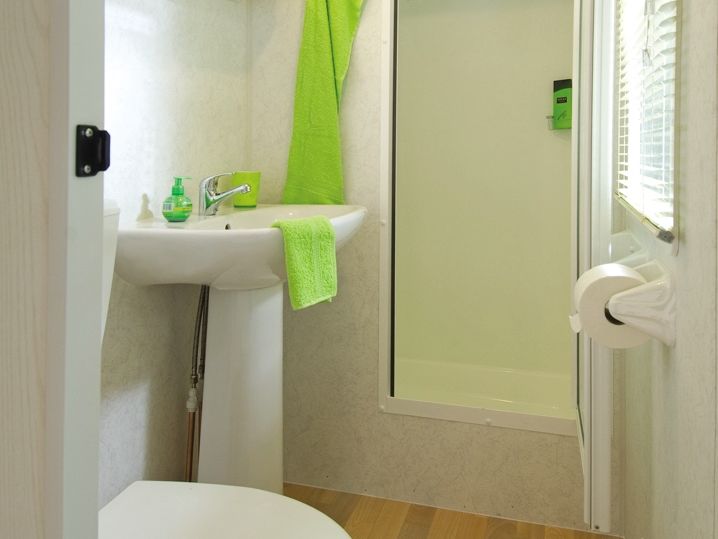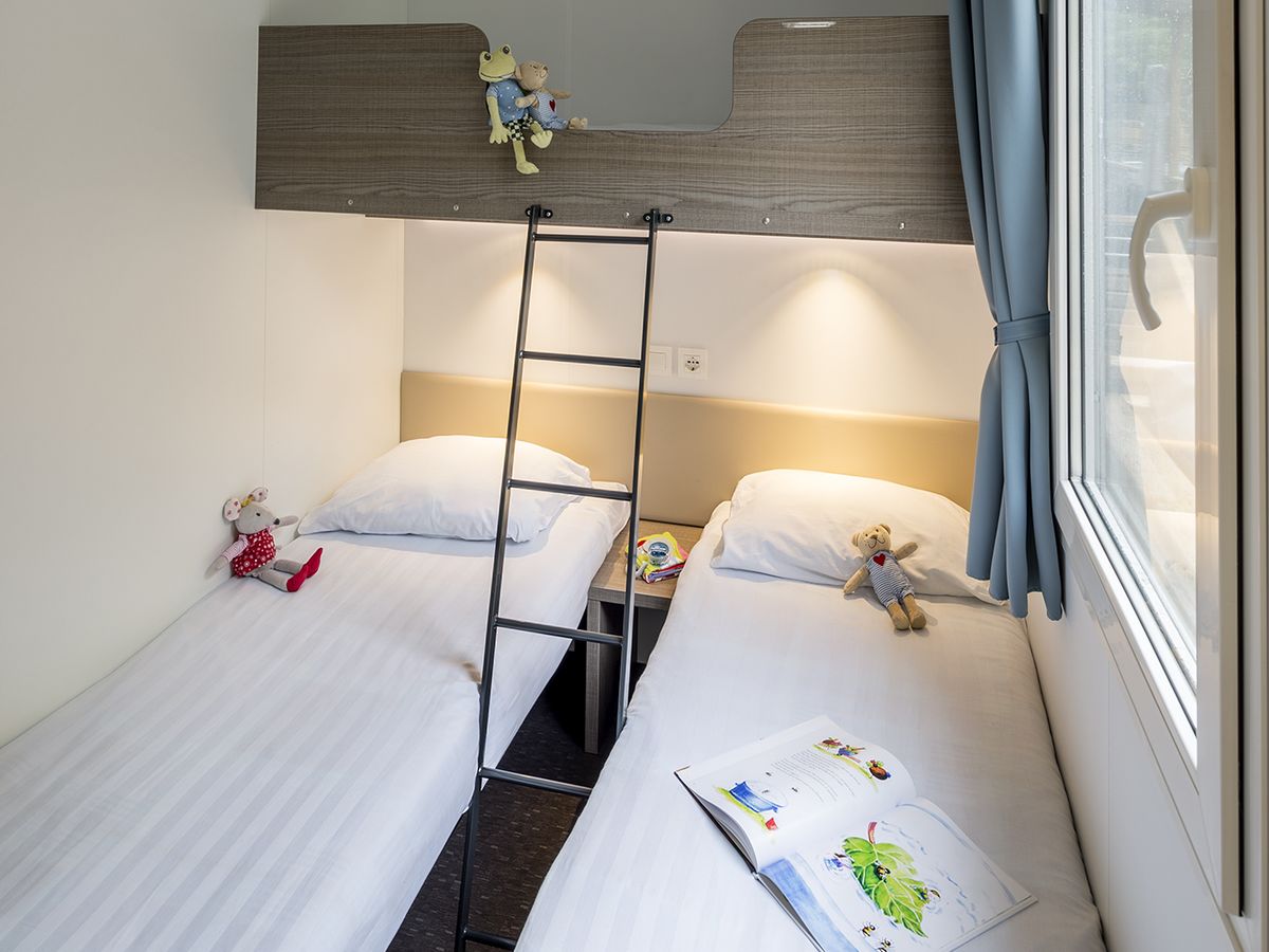Mobilheim Comfort hat 2 Schlafabteile. Das Doppelbett im Elternschlafzimmer misst stolze 2,00 x 1,40 m! Im separaten Schlafabteil für Kinder stehen 3 Einzelbetten. Je nach Campingplatz sind das entweder 1 Einzelbett und 1 Doppelstockbett (oben max. 75 kg) oder 2 Einzelbetten und ein sich quer darüber befindliches Bett. Für die ganz Kleinen kann bei unseren Mitarbeitern ein kostenloses Bettgitter dazu gemietet werden. Auf einigen Campingplätzen ist im Kinderschlafzimmer nur ein Etagenbett. In diesem Typ Mobilheim kann unter Umständen ein Kleinkind auf dem Sofa im Wohnzimmer schlafen. Alle Mobilheime sind mit Fliegengittern in den Schlafabteilen ausgestattet. Außerdem liegen überall Ein-Personen-Decken und Kissen für Sie bereit.