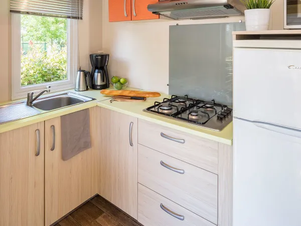 Im gemütlichen Wohnzimmer finden Sie einen Flachbildfernseher mit deutschen Sendern. Auf dem Sofa ist ein Schlafplatz. Die Küche liegt an der Vorderseite des Mobilheimes. Durch die Flügeltüren gelangen Sie direkt auf die Holzterrasse. Es erwartet Sie ein umfangreiches Kücheninventar, so dass Sie nichts von zu Hause mitbringen müssen. Die Küche des Comfort Plus Lounge Seeblick ist mit einem hohen Kühlschrank mit separatem Gefrierfach, Filterkaffeemaschine, Wasserkocher, 4-flammigem Gasherd sowie einer Mikrowelle ausgestattet. Im Badezimmer gibt es eine Dusche sowie ein Waschtisch mit Waschbecken. Die Toilette ist separat.