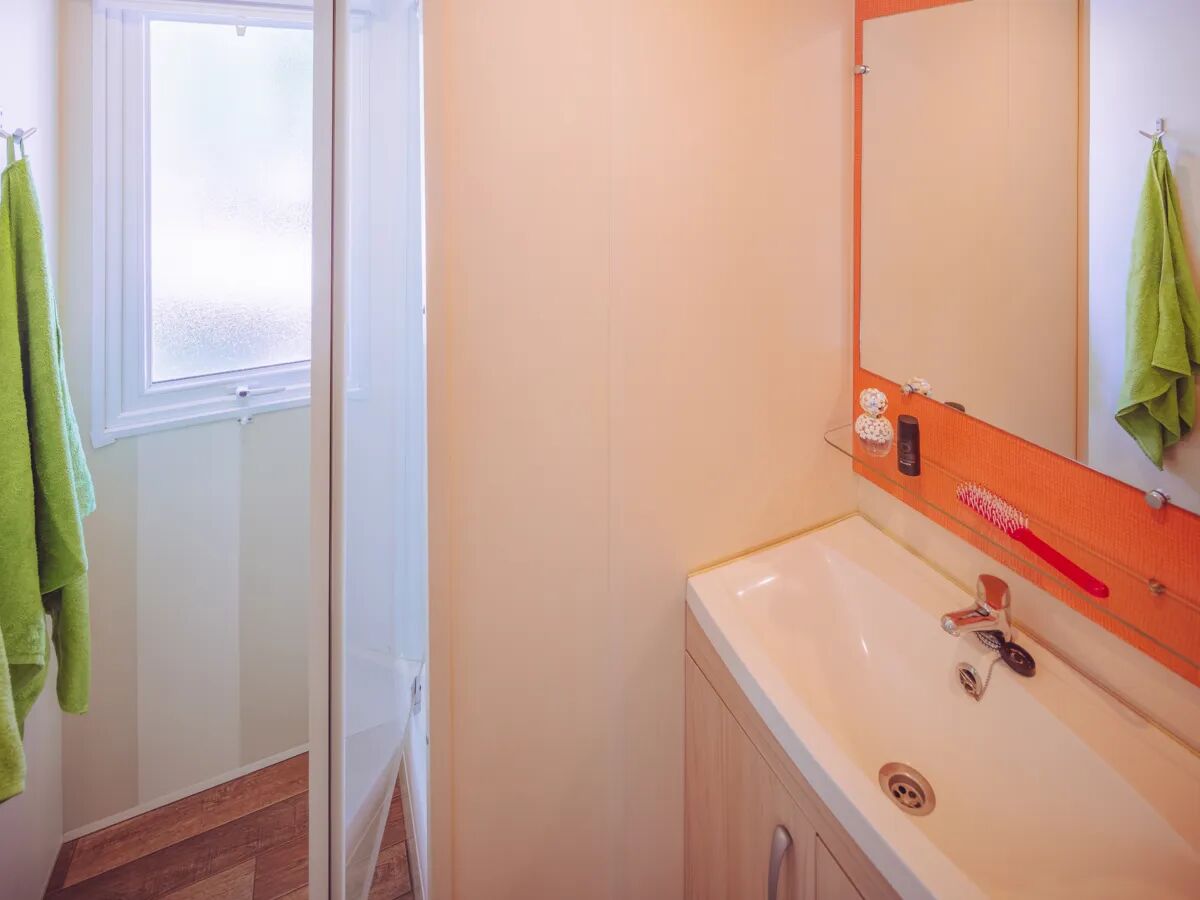 Dieses geräumige Mobilheim verfügt über 3 Schlafzimmer. Es gibt ein Elternschlafzimmer mit einem 2,00 x 1,60 m extra großem Doppelbett. Das 2. Schlafzimmer verfügt über zwei Einzelbetten und das 3. Schlafzimmer über ein Etagenbett (max. 70 kg)oder 2 Einzelbetten. Im 2. Schlafzimmer kann ein Bett unter das andere geschoben werden. So hat auch ein Babybettchen in diesem Schlafzimmer Platz. Außerdem befindet sich im Wohnzimmer ein zusätzlicher Schlafplatz. In jedem Mobilheim ist standardmäßig ein Bettgitter damit Ihr Kind nicht aus dem Bett fallen kann (entweder ein festes Metallgitter oder als loses Gitter). Alle Betten sind mit Einzeldeckbetten versehen und alle Schlafzimmerfenster verfügen über Mückengitter.