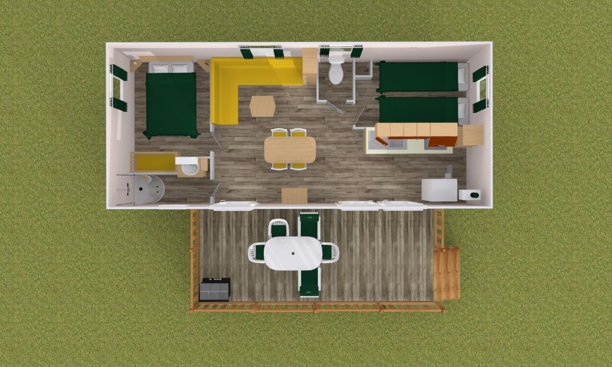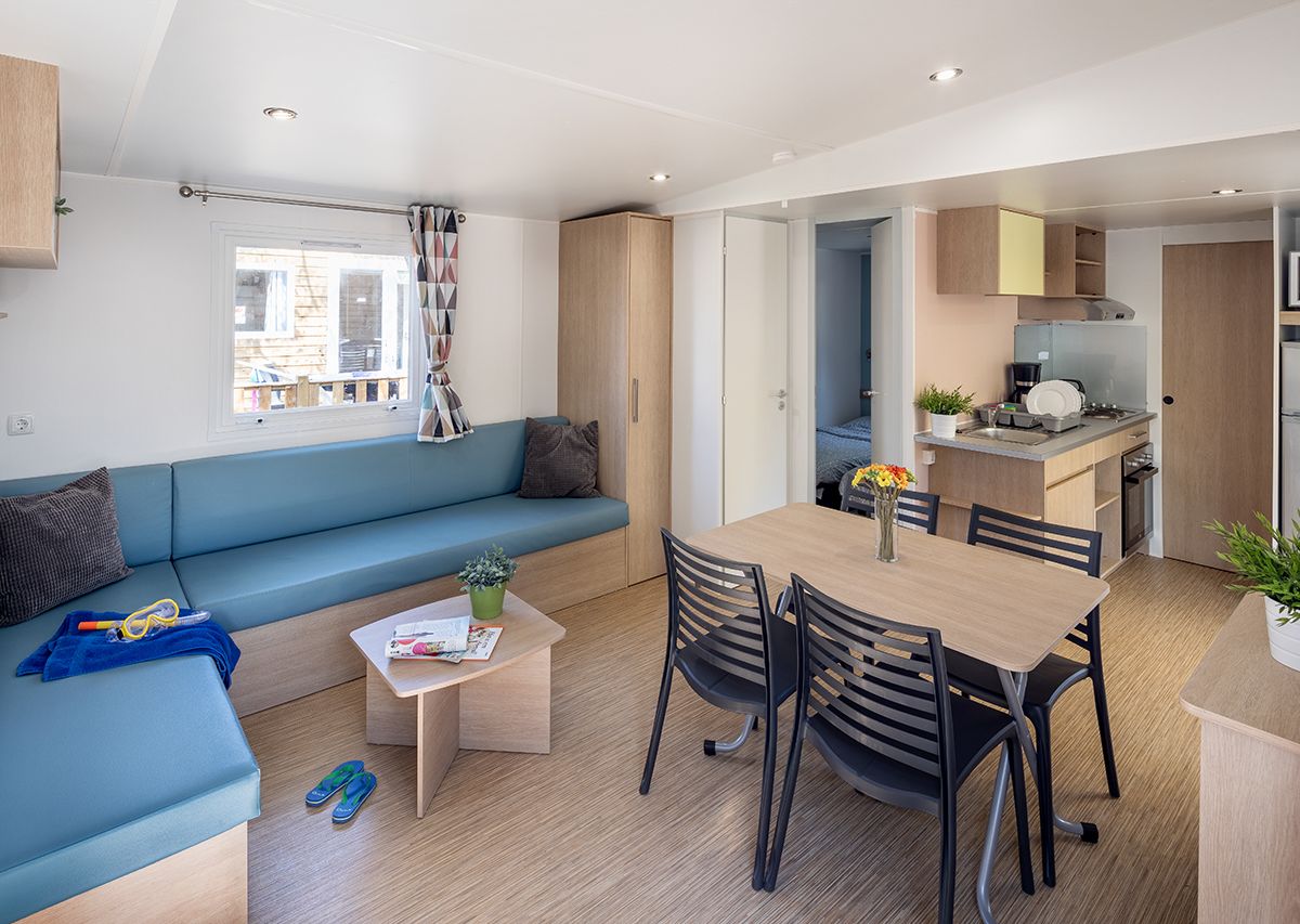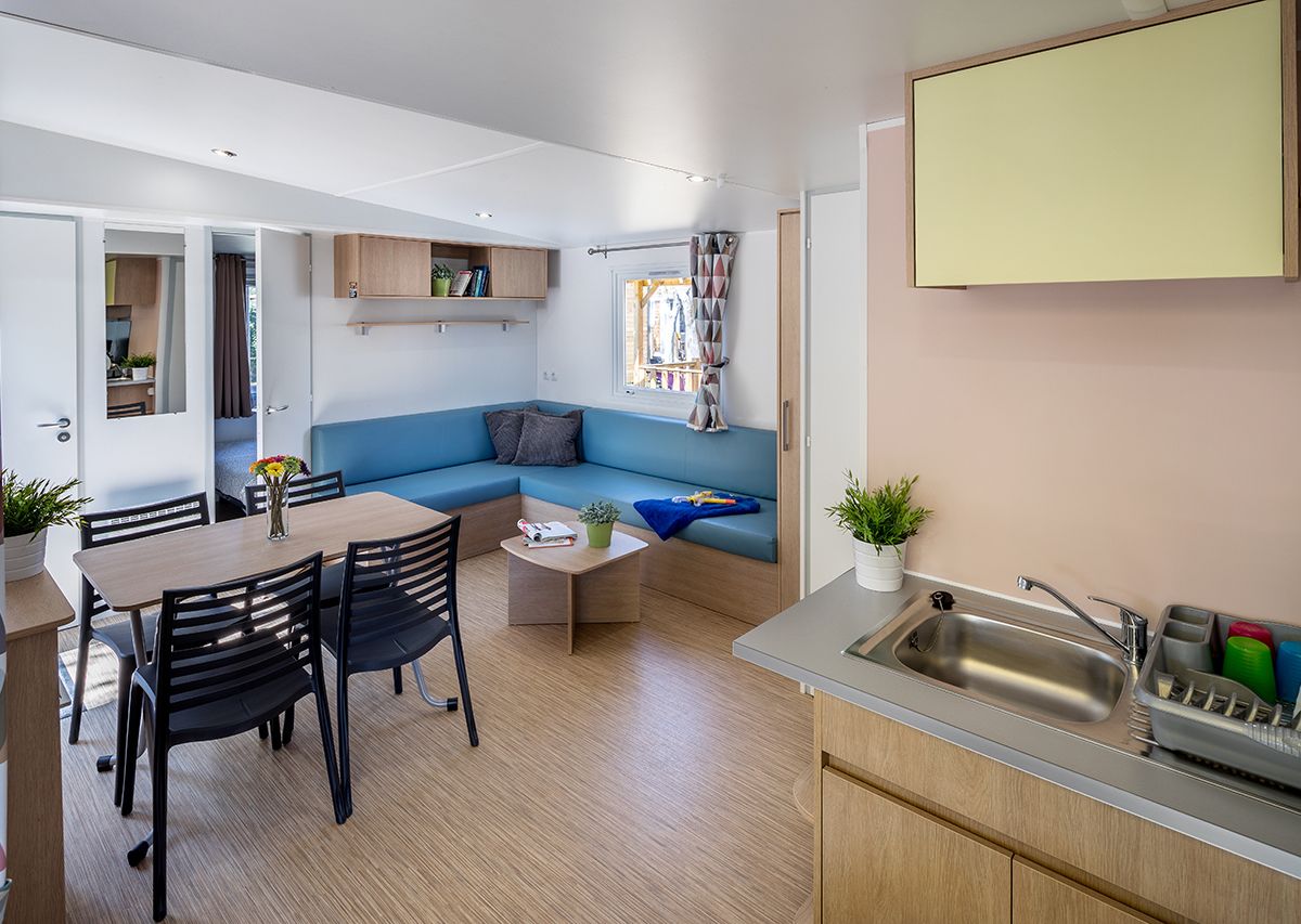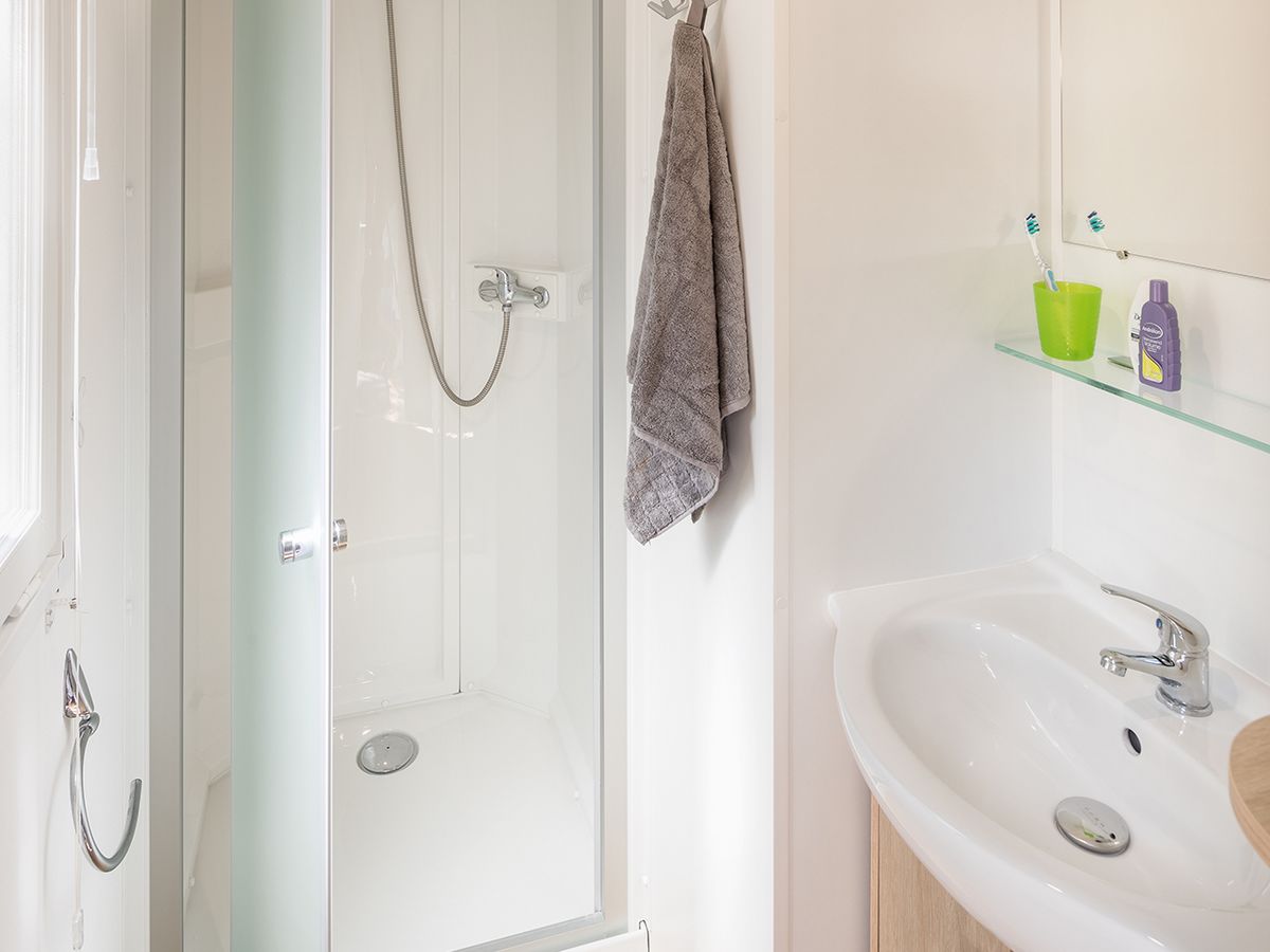 Dieses besonders geräumige Wohnzimmer verfügt über eine Essecke mit Stühlen sowie einer gemütlichen Eckbank. Die Klimaanlage befindet sich ebenfalls im Wohnzimmer. Die Küche liegt an der Vorderseite des Mobilheim, so dass Sie auch während des Kochens am Campingleben draußen teilnehmen können. Die Küche ist mit hohem Kühlschrank mit separatem Gefrierfach, Mikrowelle, elektrischen Kochplatten, Stauraum sowie fließend Kalt- und Warmwasser gut eingerichtet. Die Küche selber verfügt über ein umfassendes Inventar. Im Badezimmer finden Sie eine Dusche sowie ein Waschbecken mit fließend Kalt- und Warmwasser. Die Toilette ist getrennt vom Badezimmer.