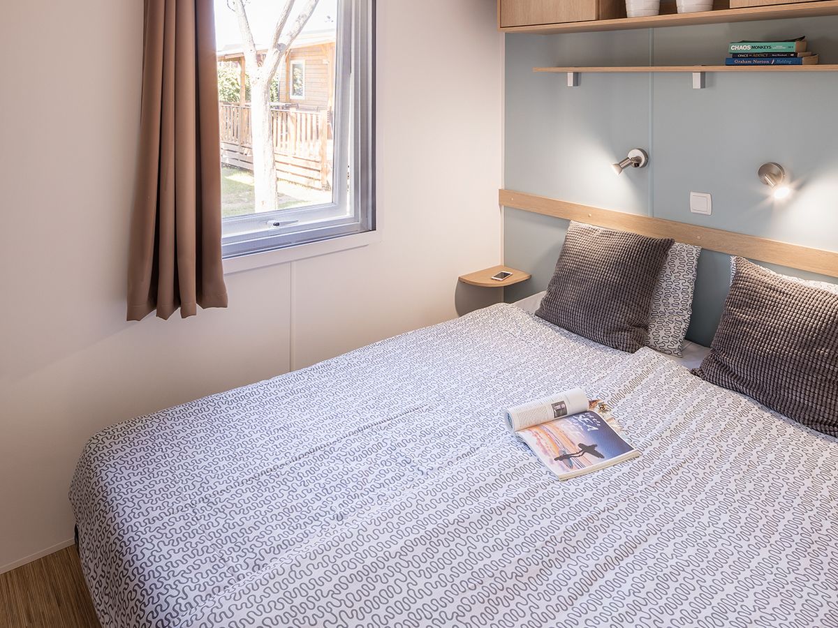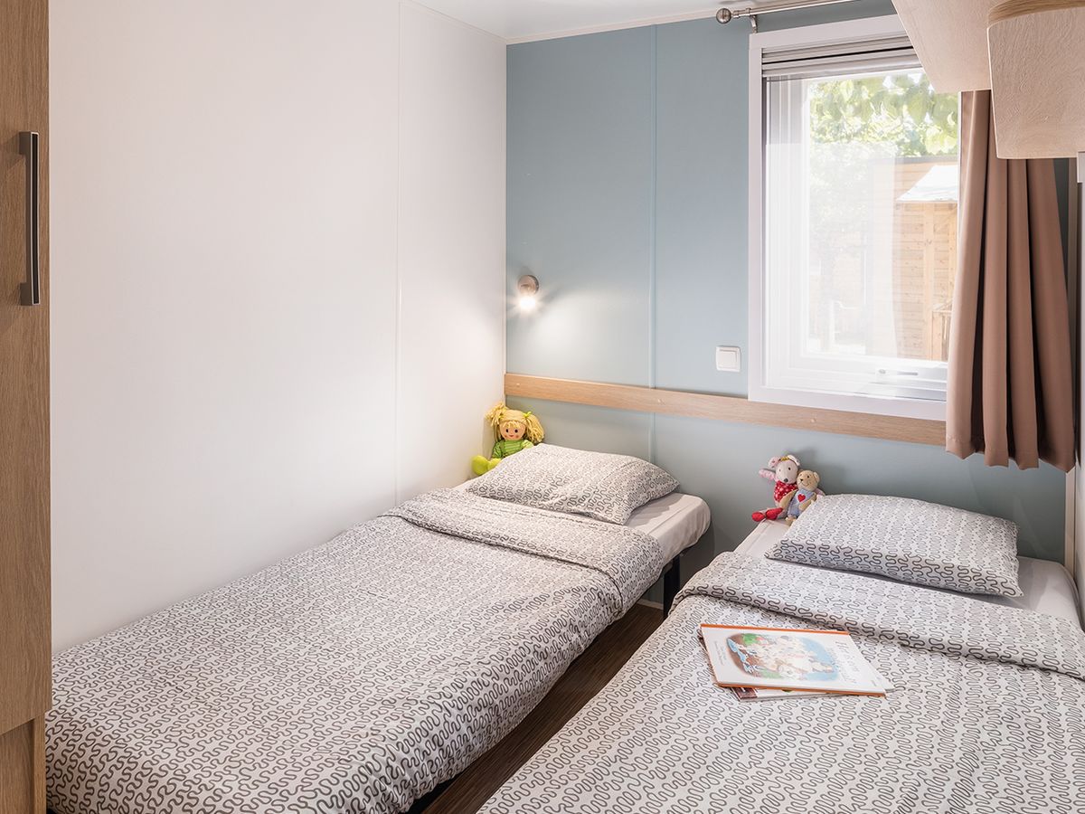 Das Mobilheim Catalunya hat zwei Schlafzimmer: Das Elternschlafzimmer mit Doppelbett (1.60 x 2.00) sowie das Kinderzimmer mit zwei Einzelbetten (0.80 x 1.90). Für Kleinkinder gibt es ein Bettgitter, dass Sie kostenlos bei unseren Mitarbeitern vor Ort ausleihen können. Das Mobilheim ist mit Einzelbettdecken und Kissen ausgestattet.