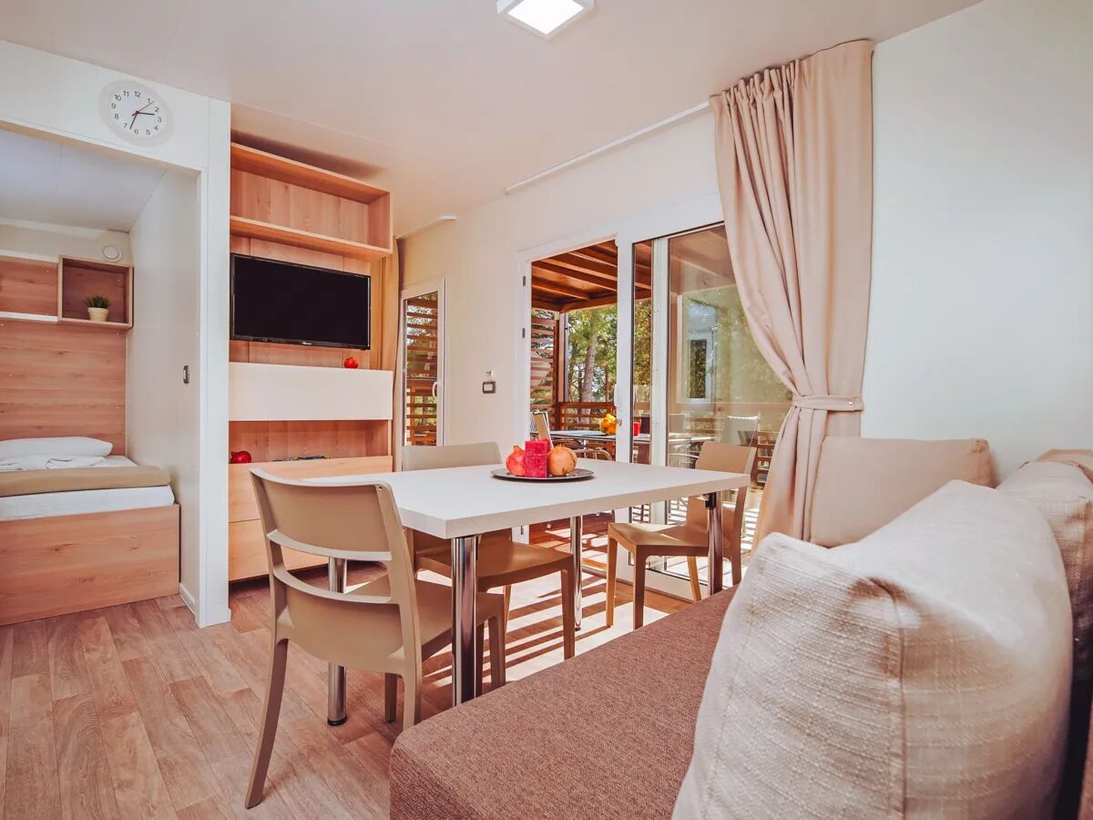 Das Premium-Mobilheim hat 2 Schlafzimmer: eines mit einem Doppelbett und das Kinderzimmer mit 2 Einzelbetten. Das Sofa im Wohnzimmer kann auch in ein Bett umgewandelt werden. Ein Bettgitter ist standardmäßig vorhanden, das Sie unter die Matratze schieben können, um zu verhindern, dass Ihr Kleinkind aus dem Bett rollt.
