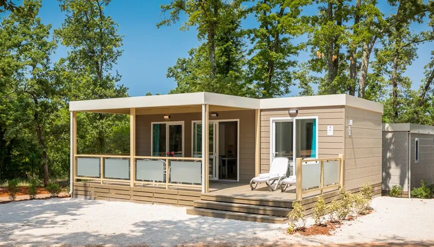 Die Küche verfügt über einen Kühlschrank mit separatem Gefrierfach, ein 4-Flammen-Gaskochfeld, eine Mikrowelle, eine Nespresso-Kaffeemaschine, einen Wasserkocher, eine Spülmaschine sowie umfangreiches Kücheninventar. Im Wohnzimmer gibt es einen Satellitenfernseher. Für zusätzlichen Komfort verfügt dieses Mobilheim über zwei Bäder. Das Badezimmer neben dem Schlafzimmer mit Doppelbett verfügt über eine große Duschkabine, ein Waschbecken und eine Toilette. Das zweite Badezimmer hat ebenfalls eine Toilette, ein Waschbecken und eine geräumige Duschkabine.