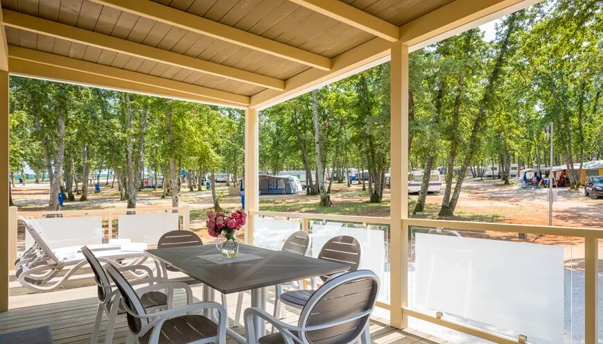 Ein weiteres Plus dieses Mobilheim Premium ist die 26 m² große, zu drei Vierteln überdachte Terrasse, sodass Sie jederzeit draußen sitzen können. Das komfortable Gartenset besteht aus einem großen Tisch, 6 Gartenstühlen und 2 Sonnenliegen. Auf der Seite des Campingplatzes können Sie nachlesen, welche kostenlose Grillplatte Ihre Unterkunft hat.